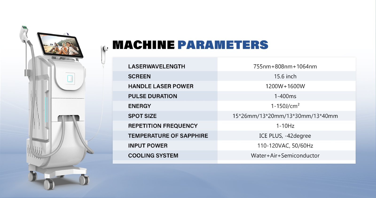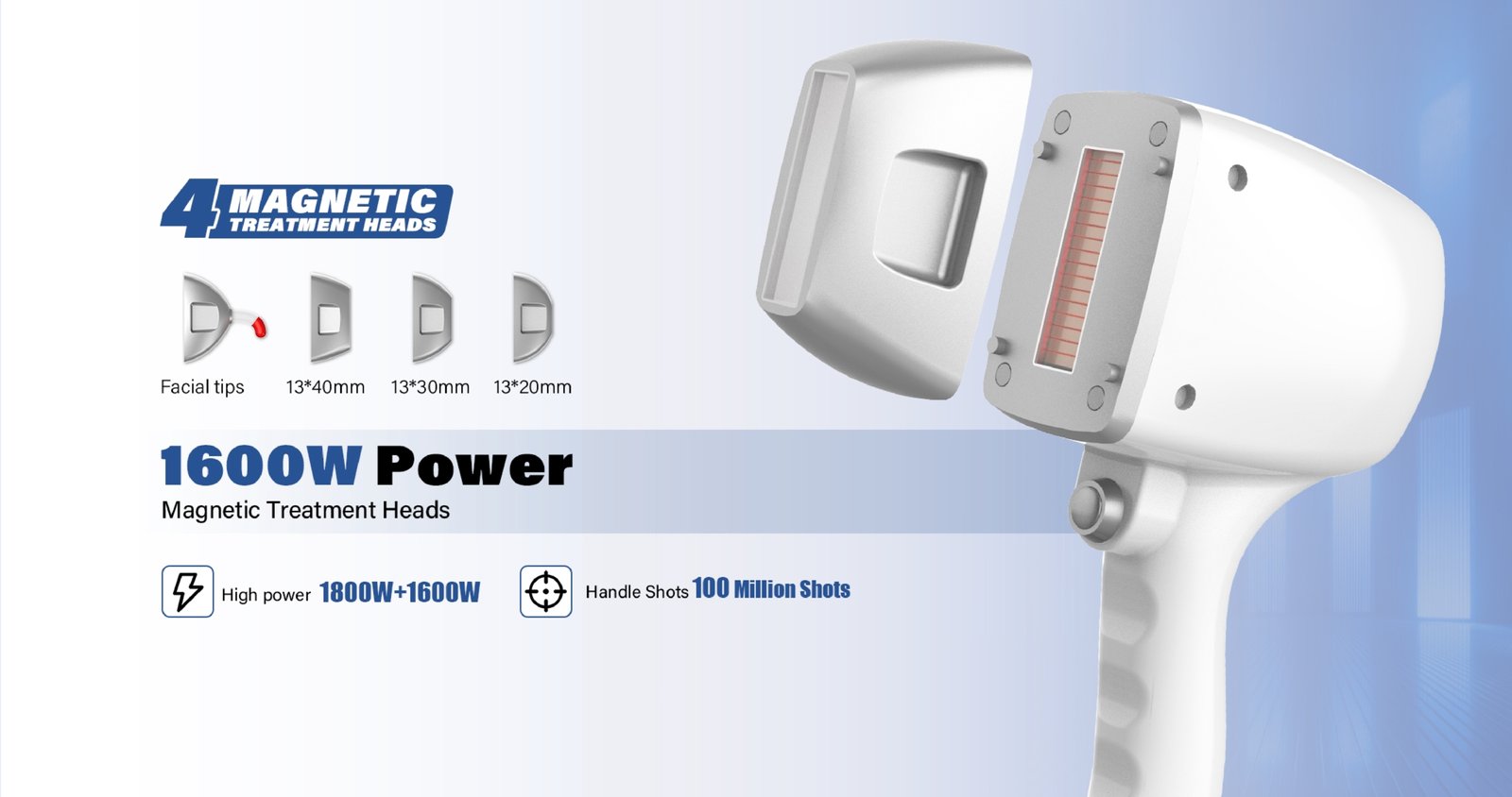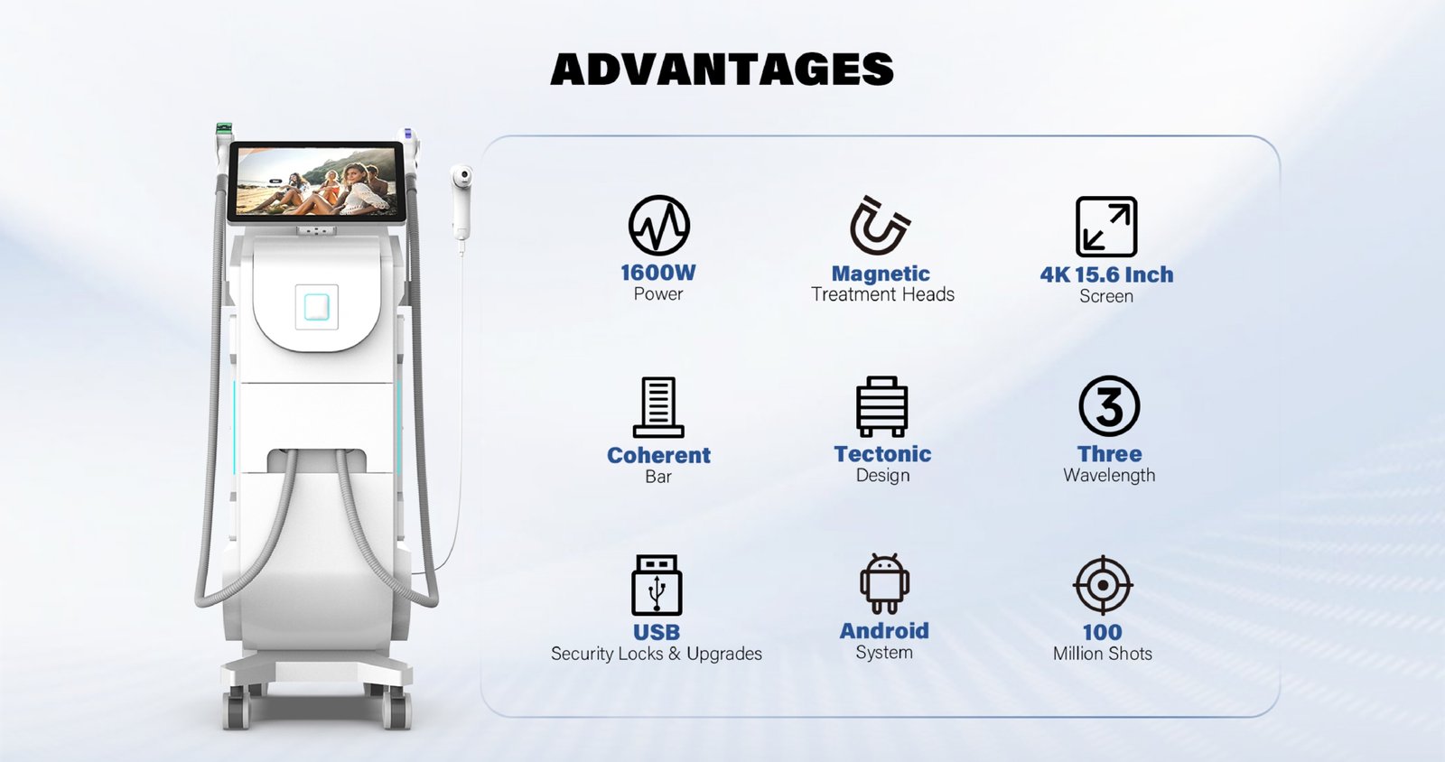 Cu o putere de până la 1600W, o durată de viață de 100 milioane impulsuri și 3 lungimi de undă (755nm, 808nm și 1064nm), aparatul oferă tratamente eficiente pentru toate tipurile de piele și fir de păr. Este ideal pentru saloane de înfrumusețare, clinici dermatologice și centre estetice care doresc să ofere servicii premium de epilare definitivă.