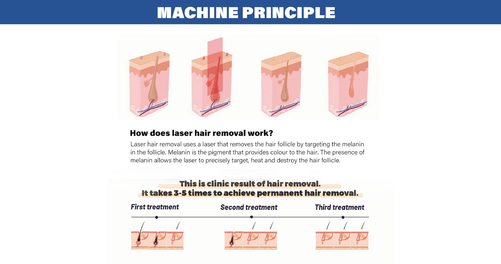 • 1064 nm (Nd:YAG) – ideal pentru pielea închisă la culoare și părul gros.